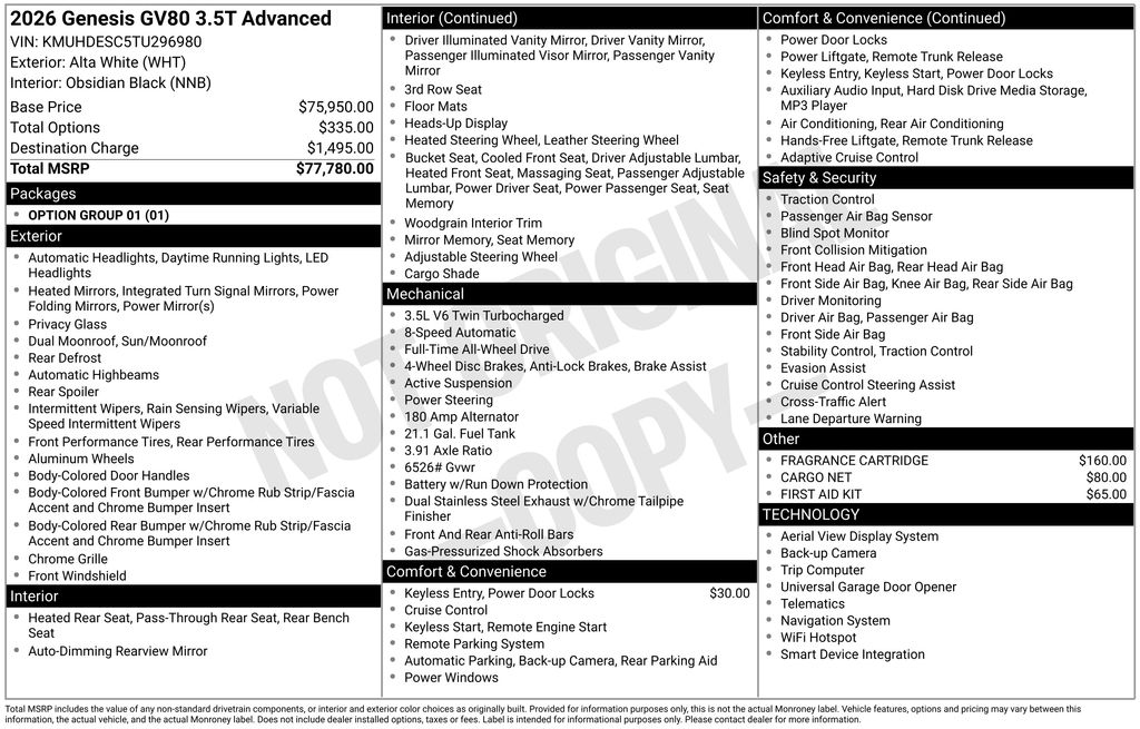 Alta White 2026 Genesis GV80 3.5T Advanced AWD 8-Speed Automatic 3.5L DOHC ABS brakes, Active Cruise Control, Alloy wheels, Compass, Electronic Stability Control, Front dual zone A/C, Heated door mirrors, Heated front seats, Heated rear seats, Illuminated entry, Low tire pressure warning, Navigation System, Power Liftgate, Power moonroof, Remote keyless entry, Traction control.