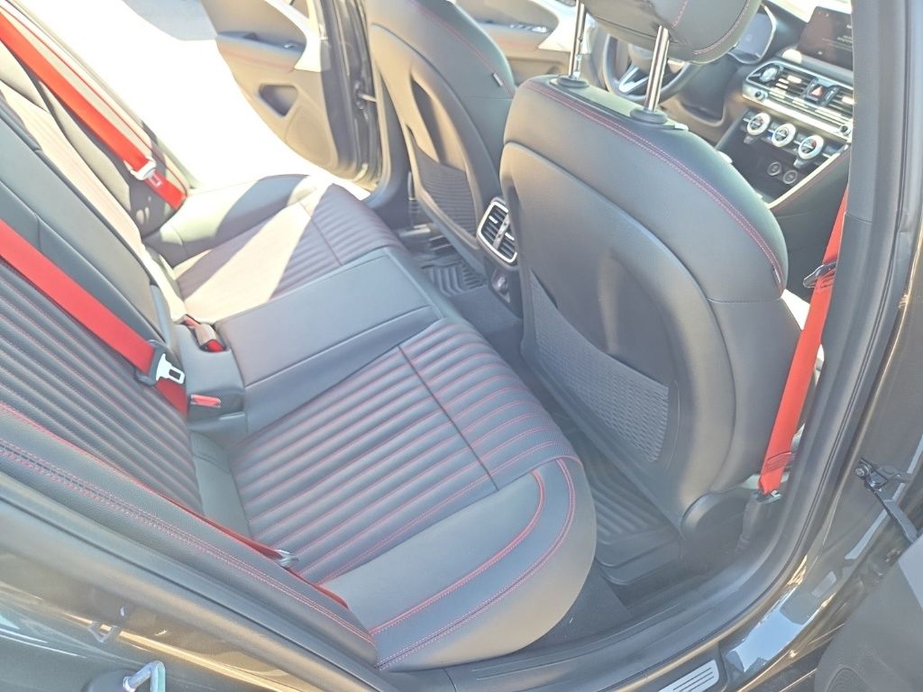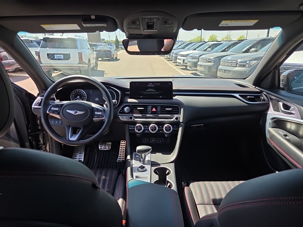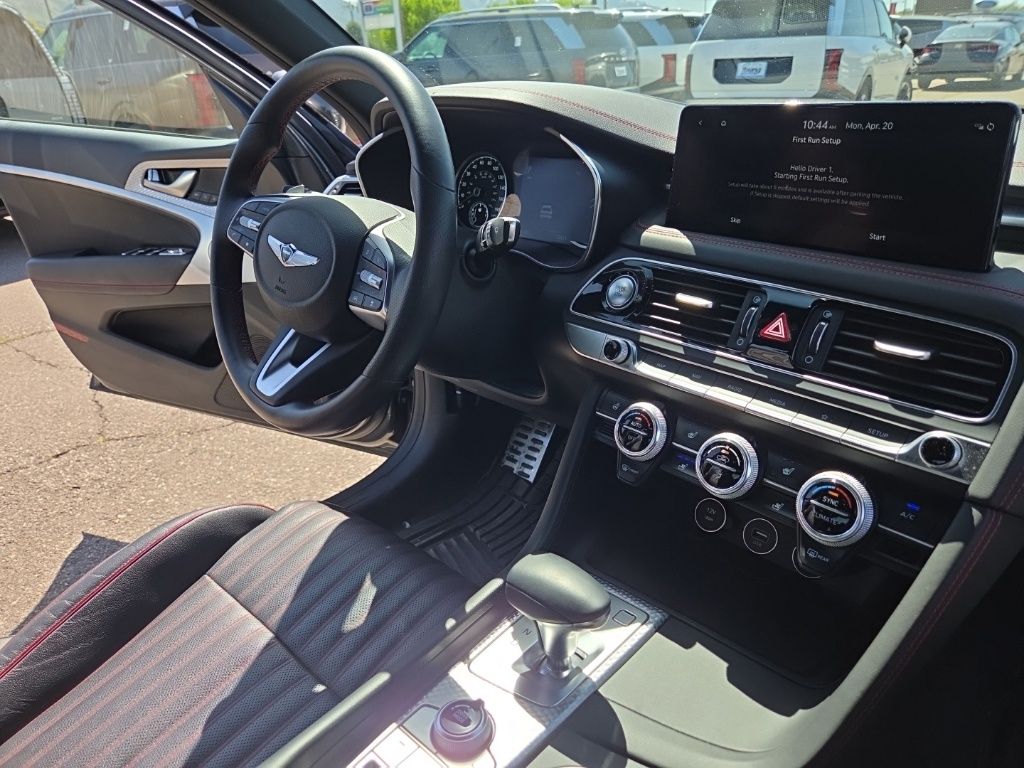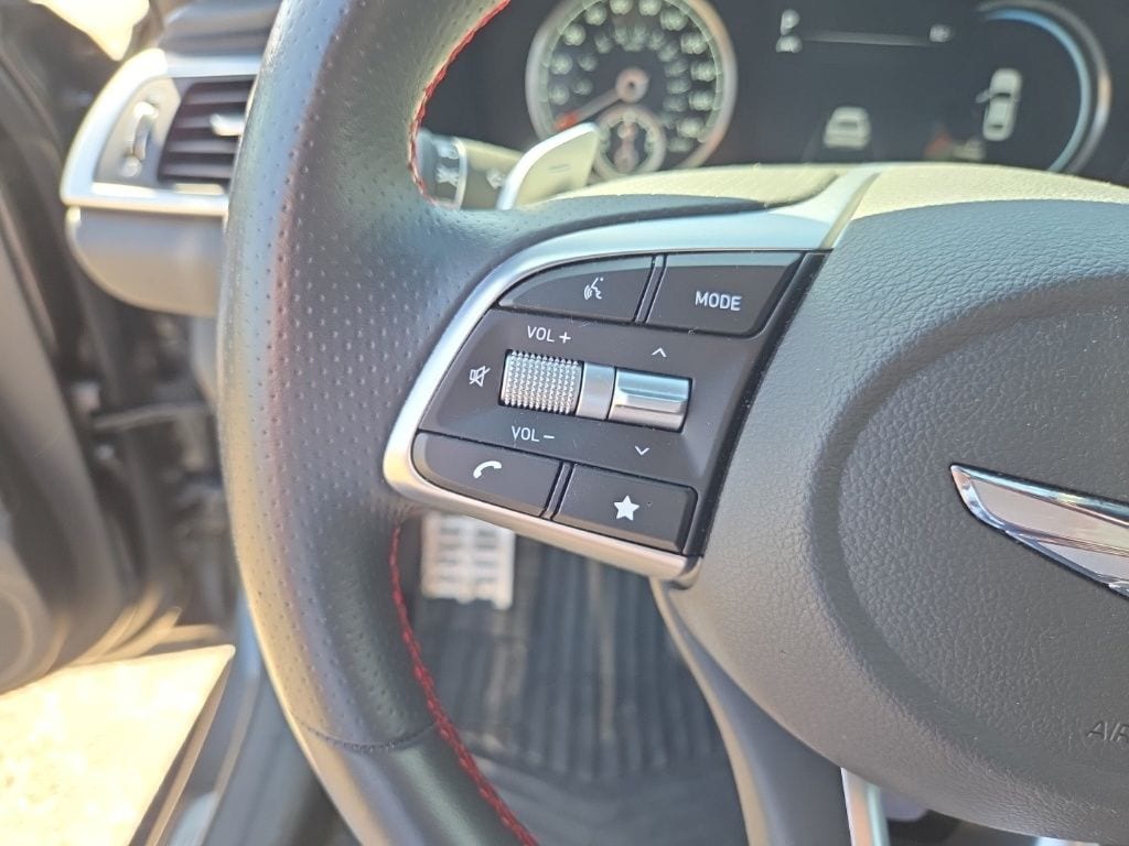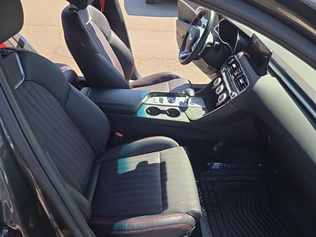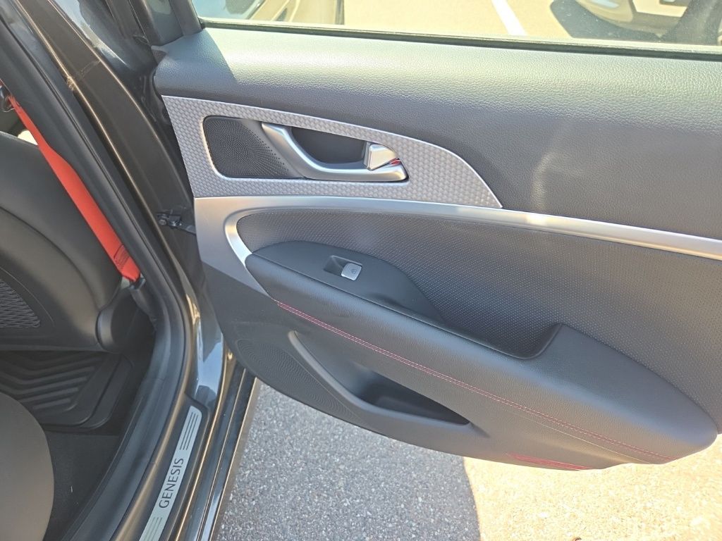 Sport Advanced Package (Acoustic Front Door Glass, Alloy Pedals, Dark Chrome Grille & Daylight Opening Trim, Forward & Reverse Parking Distance Warning, Genesis Digital Key, Option Group 03, Power Driver Seat Bolster & Cushion Extension, Radio: AM/FM/SiriusXM/HD Lexicon Prem Audio System, Sport Aluminum Trim, Variable Exhaust Valve System, Ventilated Front Seats, Wheels: 19" x 8.0J Fr & 19" x 8.5J Rr Sport Alloy, Wide Sunroof, and Wireless Device Charging), 4-Wheel Disc Brakes, 6 Speakers, ABS brakes, Air Conditioning, Alloy wheels, AM/FM radio: SiriusXM, Android Auto & Apple CarPlay, Anti-whiplash front head restraints, Auto High-beam Headlights, Auto-dimming door mirrors, Auto-dimming Rear-View mirror, Automatic temperature control, Brake assist, Bumpers: body-color, Delay-off headlights, Driver door bin, Driver vanity mirror, Dual front impact airbags, Dual front side impact airbags, Electronic Stability Control, Emergency communication system: Genesis Connected Services, Exterior Parking Camera Rear, Four wheel independent suspension, Front anti-roll bar, Front Bucket Seats, Front Center Armrest, Front dual zone A/C, Front reading lights, Fully automatic headlights, Garage door transmitter: HomeLink, Heated door mirrors, Heated front seats, Heated Multi-Adjustable Front Bucket Seats, Heated steering wheel, Illuminated entry, Knee airbag, Leather Seating Surfaces, Low tire pressure warning, Memory seat, Navigation System, Occupant sensing airbag, Outside temperature display, Overhead airbag, Overhead console, Panic alarm, Passenger door bin, Passenger vanity mirror, Power door mirrors, Power driver seat, Power passenger seat, Power steering, Power windows, Radio: AM/FM/SiriusXM/HD Audio System, Rain sensing wipers, Rear anti-roll bar, Rear reading lights, Rear seat center armrest, Rear window defroster, Remote keyless entry, Security system, Speed control, Speed-sensing steering, Speed-Sensitive Wipers, Split folding rear seat, Steering wheel memory, Steering wheel mounted audio controls, Tachometer, Telescoping steering wheel, Traction control, Trip computer, Turn signal indicator mirrors, Variably intermittent wipers, and Wheels: 19" x 8.0J Fr & 19" x 8.5J Rr Alloy.