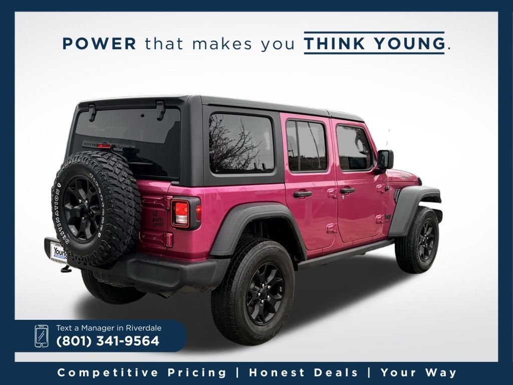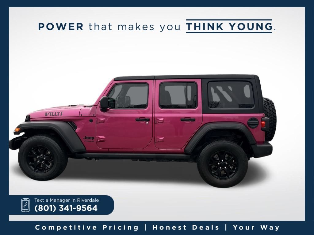 The 2022 Jeep Wrangler Unlimited Willys is a rugged, trail-ready four-door SUV that combines iconic Jeep capability with enhanced off-road performance and distinctive styling. Built to handle tough terrain with confidence, it features trail-focused suspension, aggressive tires, and Willys-specific design cues that give it extra traction and a bold look. The spacious Unlimited cabin offers room for passengers and gear, while modern conveniences make daily driving comfortable and enjoyable. Whether youâre hitting the trails or cruising around town, this Wrangler Unlimited Willys delivers legendary Jeep adventure with everyday versatility.