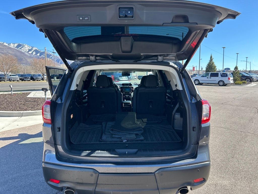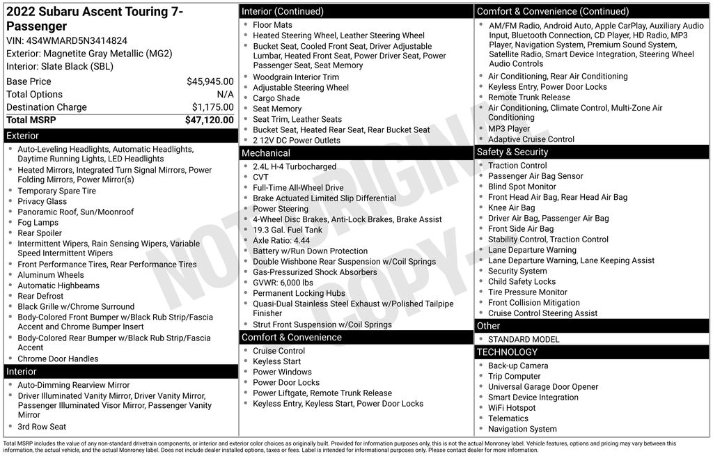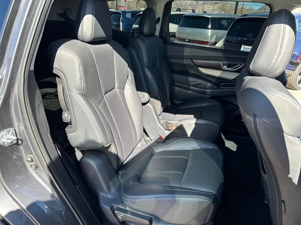 Standard Model, 14 Speakers, 3rd row seats: bench, 4-Wheel Disc Brakes, ABS brakes, Air Conditioning, Alloy wheels, AM/FM radio: SiriusXM, Auto High-beam Headlights, Auto-dimming Rear-View mirror, Automatic temperature control, Axle Ratio: 4.44, Brake assist, Bumpers: body-color, CD player, Compass, Delay-off headlights, Driver door bin, Driver vanity mirror, Dual front impact airbags, Dual front side impact airbags, Electronic Stability Control, Emergency communication system: STARLINK Safety and Security (Subscription Required), Exterior Parking Camera Rear, Four wheel independent suspension, Front anti-roll bar, Front Bucket Seats, Front Center Armrest, Front dual zone A/C, Front fog lights, Front reading lights, Fully automatic headlights, Garage door transmitter: HomeLink, harman/kardon® Speakers, Heated & Ventilated Front Bucket Seats, Heated door mirrors, Heated front seats, Heated rear seats, Heated steering wheel, Illuminated entry, Knee airbag, Low tire pressure warning, Memory seat, Navigation System, Occupant sensing airbag, Outside temperature display, Overhead airbag, Overhead console, Panic alarm, Passenger door bin, Passenger vanity mirror, Perforated Leather-Trimmed Upholstery, Power door mirrors, Power driver seat, Power Liftgate, Power moonroof, Power passenger seat, Power steering, Power windows, Radio data system, Radio: Subaru STARLINK 8.0" Multimedia Nav System, Rain sensing wipers, Rear air conditioning, Rear anti-roll bar, Rear reading lights, Rear window defroster, Rear window wiper, Reclining 3rd row seat, Remote keyless entry, Security system, Speed control, Split folding rear seat, Spoiler, STARLINK/Apple CarPlay/Android Auto, Steering wheel mounted audio controls, Tachometer, Telescoping steering wheel, Tilt steering wheel, Traction control, Trip computer, Turn signal indicator mirrors, Variably intermittent wipers, Ventilated front seats, and Wheels: 20" x 7.5 J Dk Gray Alloy w/Machine Finish.